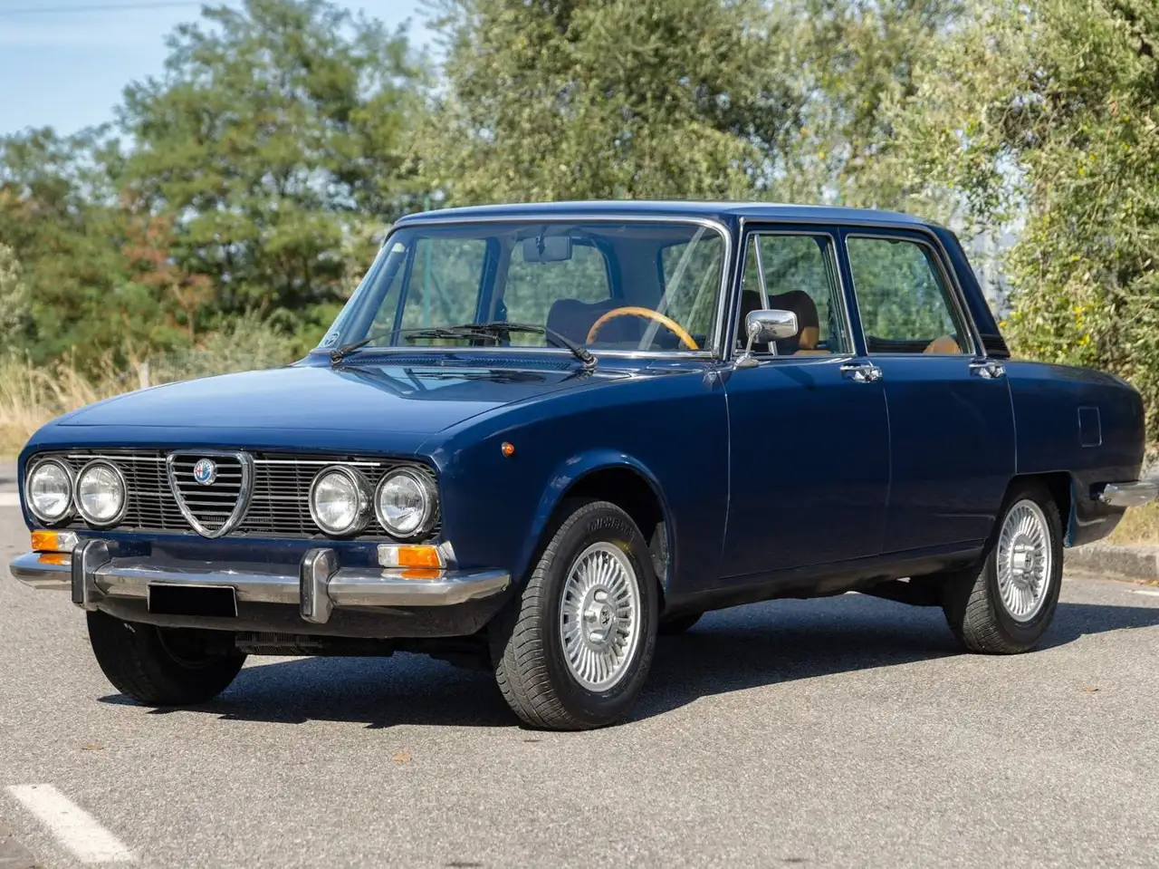 Alfa Romeo 1750 Berlina is a charismatic classic Italian saloon Finished in an elegant hue of Blu Olandese over an Ochre vinyl-trimmed interior, featuring wood veneer trims, chrome accents, and red floor mats.